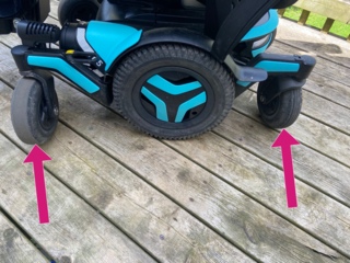 Wheelchair with severely worn front tires due to caster flutter