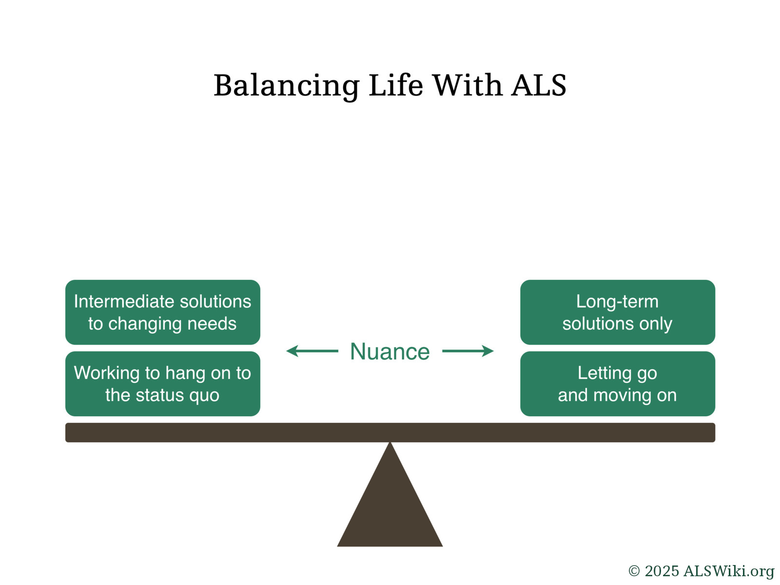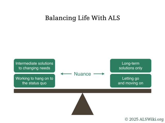 Making decisions related to life with ALS often involves trying to strike a balance between putting in effort to maintain an existing standard of life for as long as possible, or letting it go and adapting to new ways of life.